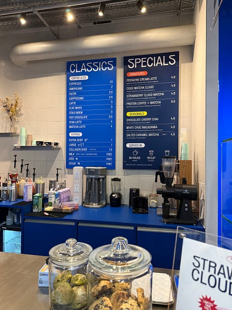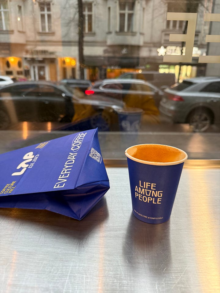 Мої окуляри запотіли і були заляпані дощеснігом, тому коли підішла робити замовлення, то баріста запитав чи я окей. Я відповіла, що так, зробила своє замовлення і він ще уточнив чи збираю наліпки на безкоштовний напій. “Ні, взагалі вперше тут”, – була моя відповідь. Тоді цей баріста вирішив подарувати мені до кави ще печенько. Смішно, бо я вагалася, що солодкого купити, але через купу емоцій не могла вибрати, тому це було приємним сюрпризом дня.